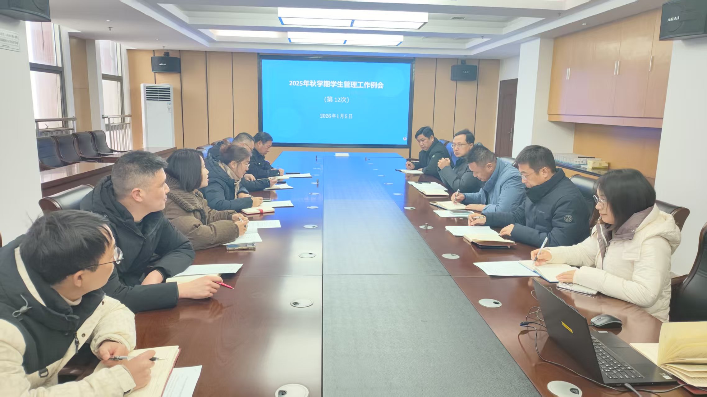 1月5日上午,学校九楼会议室召开本学期第十二次学生管理工作例会。周勇副校长、苏辉副校长、学生管理服务中心主任施文龙、团委书记徐莹出席会议,各系部学生管理工作相关负责人参会。