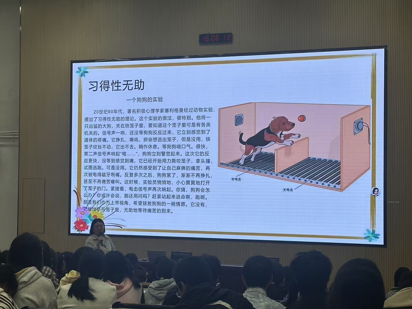 讲座以“习得性无助”为切入点,结合学生日常学习生活,揭示其与抑郁情绪的关联,让学生直观理解心理困境的形成机制,并给出实用建议。通过对“同一性”阶段的认识,引导学生们找到自己的定位,并为未来做好准备。