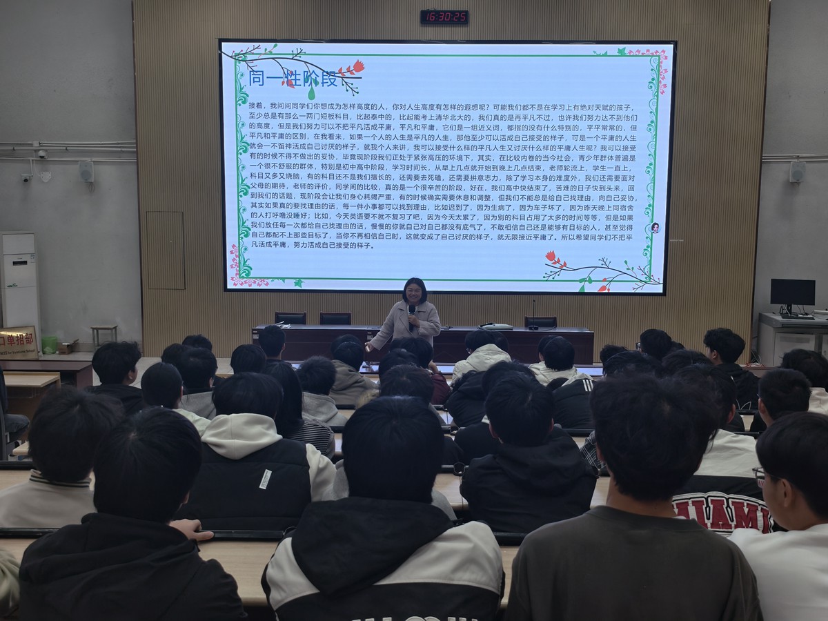 为帮助学生破解成长困惑,摆脱心理内耗,树立积极向上的人生态度,我校于2025年11月12日下午面向机电系学生举办了以“从躺平到掌控,人生谁来定位”为主题的心理健康讲座,此次讲座由学校专职心理健康教师黄文婷主讲。