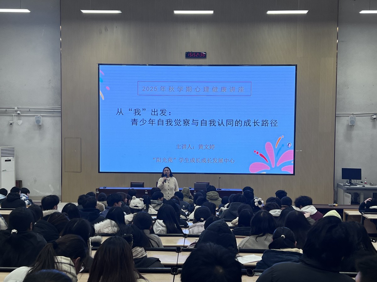 为助力青少年提升自我觉察能力,构建健康稳固的自我认同,2025年12月25日下午,我校举办了以“从‘我’出发:青少年自我觉察与自我认同的成长路径”为主题的心理健康专题讲座。此次讲座由学校专职心理健康教师黄文婷主讲,化工系和建筑系高二年级全体学生齐聚现场,共同开启一场探索内心的成长之旅。