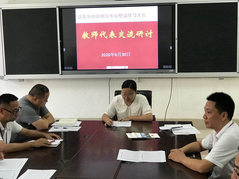 6月30日下午,按照师德师风专项整治活动的计划,建筑系全体教师在会议室集中学习,刘猛主任主持召开,周雨、成飞等几位教师代表就师德师风专项整治工作第一阶段进行了交流研讨。