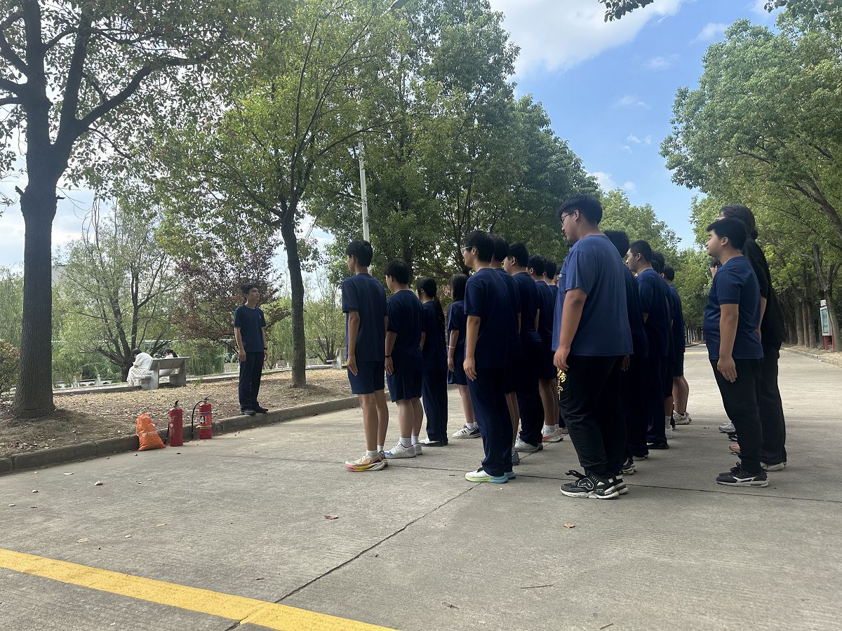 仅用时5分钟,所有学生均安全抵达集合点。各舍长快速清点人数,汇总至班主任后,再由班主任向总指挥生飞主任汇报“应到人数、实到人数、有无缺漏”。随后,生飞主任对演练进行总结,肯定全体人员的规范操作,同时重申宿舍消防安全的重要性。14:45,随着“演练结束”指令下达,各班有序退场,演练圆满完成。此外,现场还展示了消防水带、应急照明设备等器材的使用方法,进一步丰富学生的消防安全知识储备。