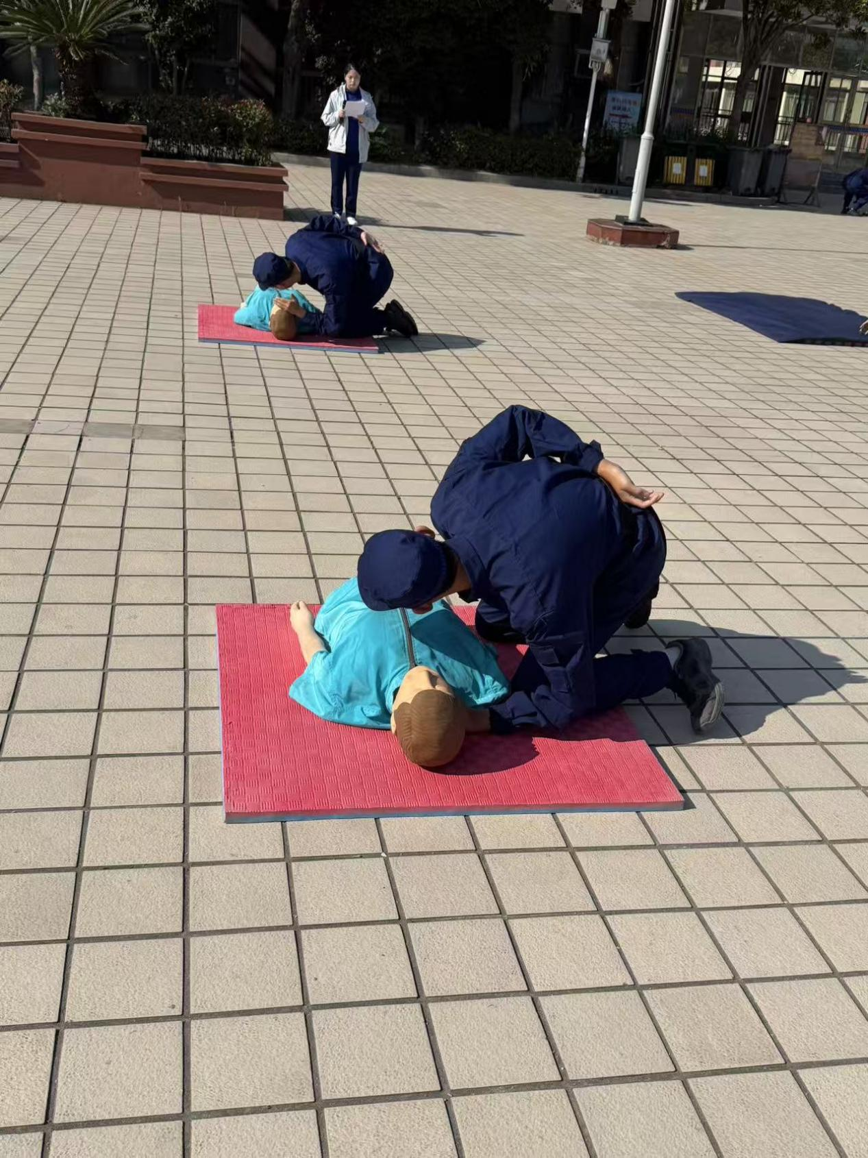 应急急救展示环节凸显专业性与实用性。心肺复苏(CPR)演示中,学子们面对模拟伤员,冷静判断、快速处置,先检查意识和呼吸,再摆放正确体位,随后按照每分钟 100-120 次的频率进行胸外按压,按压深度、频率精准把控,配合人工呼吸时的气道开放、吹气节奏恰到好处。