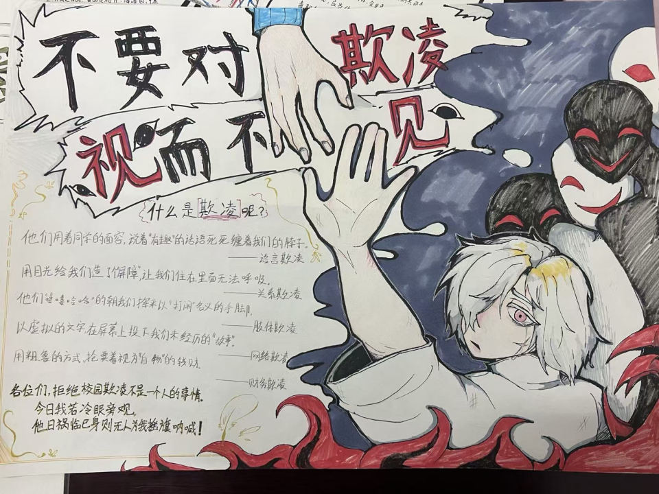 本次比赛设置了三个主题方向——“珍爱生命,远离毒品”“消防安全,人人有责”和“拒绝校园欺凌,共建和谐校园”。同学们根据兴趣自由选择主题。活动期间,大家热情高涨,有的以鲜明对比的色彩警示毒品危害,有的用清晰的示意图讲解消防逃生要点,还有的以温暖的画面传递友善互助、反对欺凌的力量,展现出同学们对安全知识的理解与对文明校园的向往。