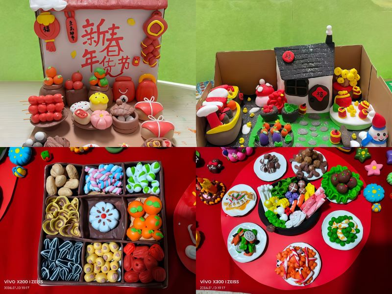 活动现场,同学们以指尖巧思揉捻彩泥,将灯笼、福字、年货市集等新春元素化为生动立体的手工作品,让年味在创意中“活”了起来。同学们将超轻粘土塑造成一个个鲜活的新年意象:有的同学搭建起微型“福气小院”,有的同学还原了新春市集的热闹场景,还有的同学创作了美食宴。同学们用揉、捏、搓、贴的手法,把对新年的期待揉进每一块粘土里。同学们还用红纸剪裁各式各样的年画,表达对马年的期盼与美好祝愿。