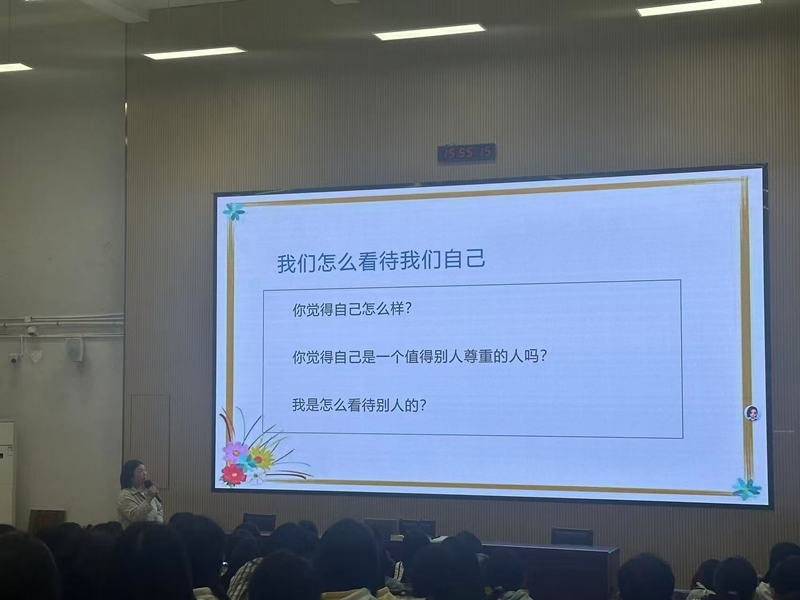 讲座伊始,黄文婷老师并未直接展开理论讲解,而是以三个直击内心的问题切入:“你觉得自己怎么样?”“你觉得自己是一个值得别人尊重的人吗?”“我是怎么看待别人的?”。简单的问句瞬间拉近了与学生的距离,让在场同学从日常的忙碌中抽离,开始直面自我内心——这一环节不仅打破了传统讲座的单向输出模式,更为后续“认识自我、调整自我”的核心内容埋下伏笔。