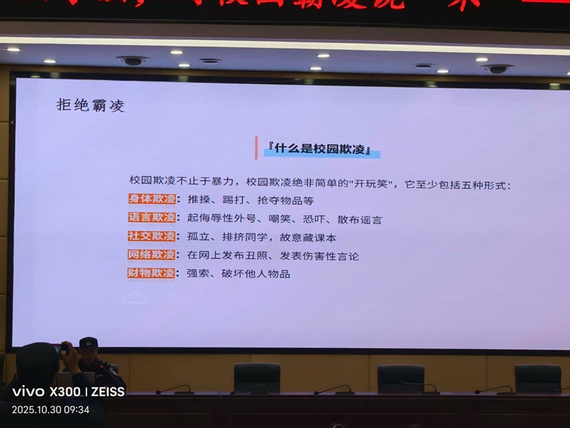 针对“聚焦霸凌——它不是‘玩笑’,是伤害与违法”,民警详细拆解了校园欺凌的五种主要形式:身体欺凌(推揉、踢打、抢夺物品)、语言欺凌(起侮辱性外号、嘲笑、恐吓、散布谣言)、社交欺凌(孤立、排挤同学,故意藏匿课本)、网络欺凌(网上发布丑照、发表伤害性言论)、财物欺凌(强索、破坏他人物品)。通过展示真实案例,民警还原了不同类型校园霸凌对受害者造成的心理创伤与现实危害,打破了部分学生“霸凌只是同学间玩笑”的错误认知,明确指出“任何形式的校园霸凌都属于违法行为,必将承担相应法律后果”。