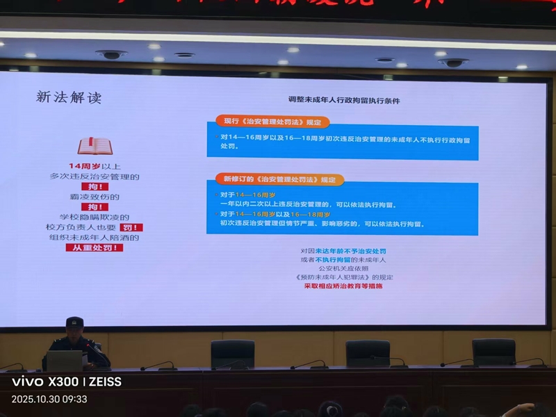 在“新法解读——年龄不是‘护身符’,法律有红线”环节,民警重点介绍了新修订的《治安管理处罚法》中关于未成年人行政拘留执行条件的调整。他对比现行法律与修订后法律的差异,明确指出:“以往14-16周岁及16-18周岁初次违反治安管理的未成年人不执行行政拘留,但修订后,14-16周岁未成年人若一年以内二次以上违反治安管理,或14-16周岁、16-18周岁未成年人初次违反治安管理但情节严重、影响恶劣(如霸凌致伤),均可依法执行拘留。”同时,民警强调,学校若隐瞒欺凌事件,校方负责人将面临处罚;组织未成年人陪酒等行为,也将依法从重处罚,让在场学生深刻认识到“法律红线不可触碰,年龄绝非违法‘护身符’”。