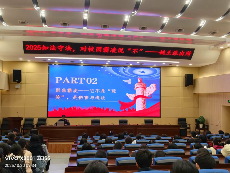 为进一步增强学生法治意识,筑牢校园安全防线,有效预防和遏制校园霸凌行为,营造安全、和谐、文明的育人环境,10月30日,姚王派出所走进我校开展校园防欺凌讲座,以“知法守法,对校园霸凌说‘不’”为主题,管理工程系组织学生参加。